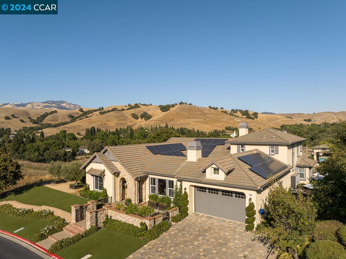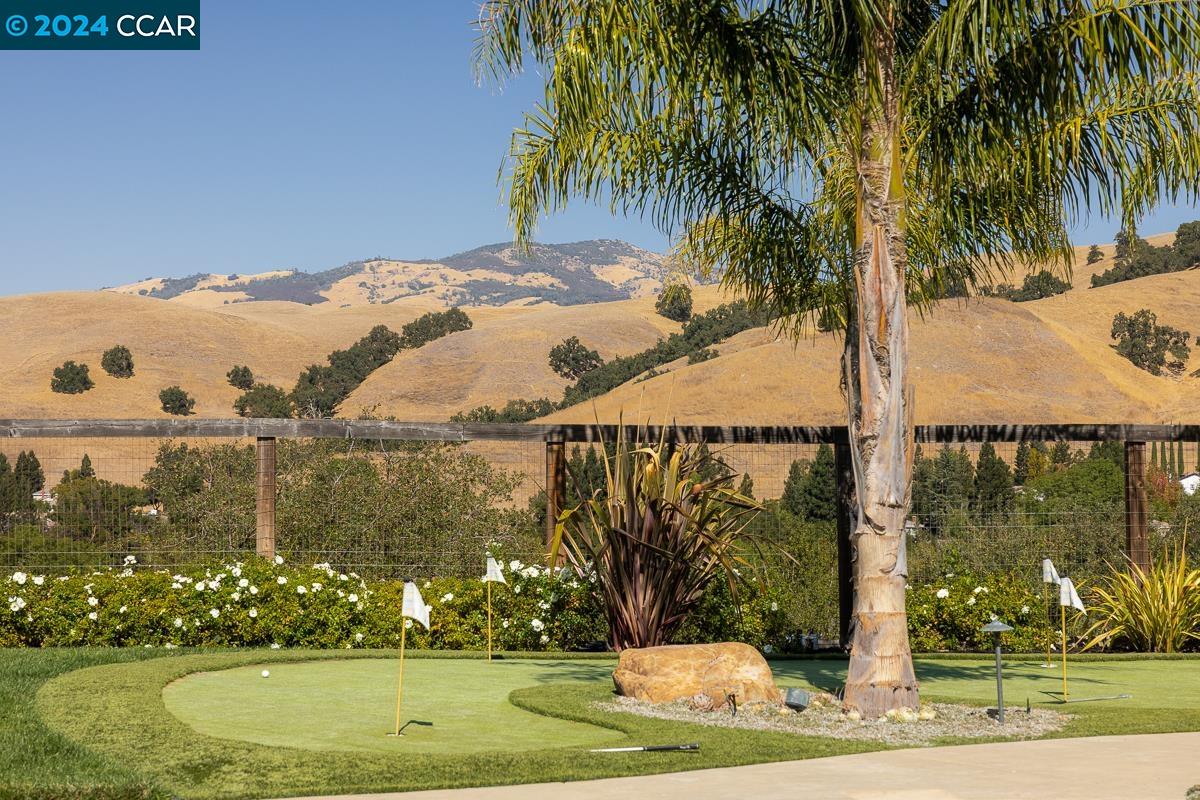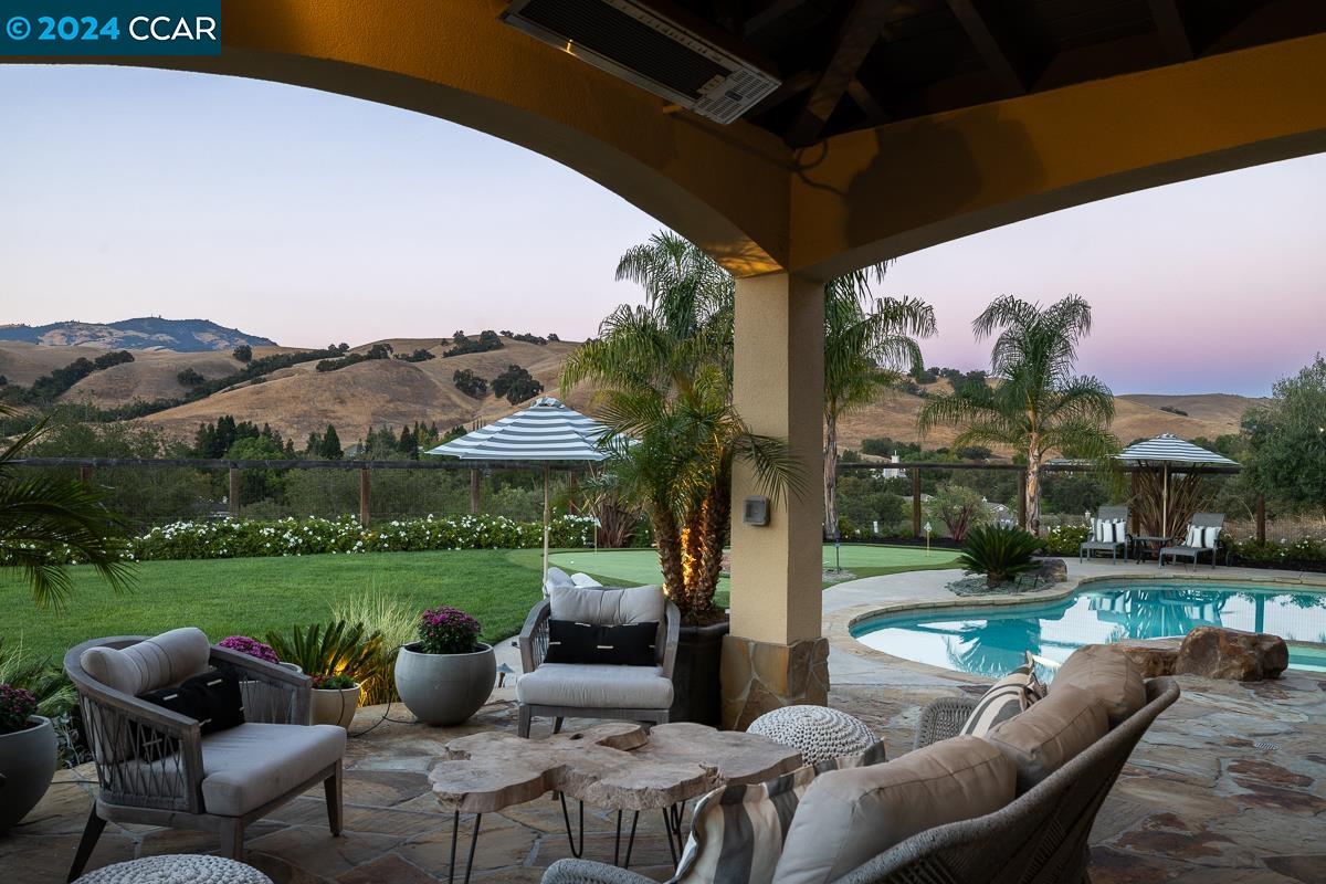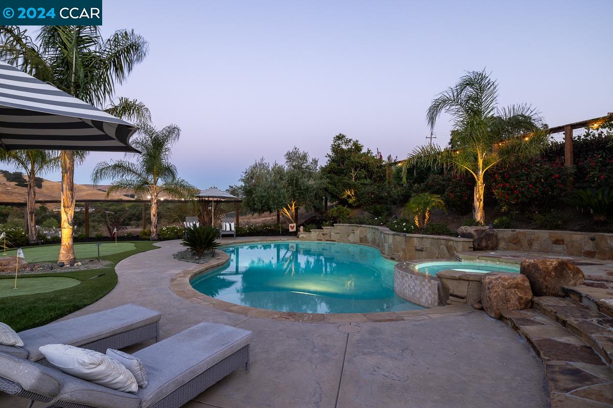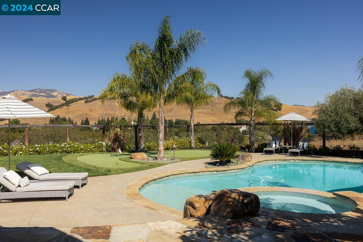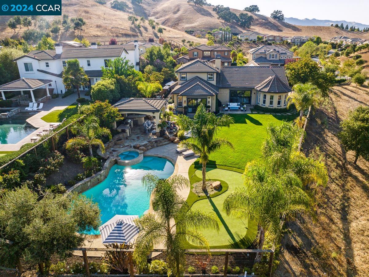 Exquisite VIEW home w/panoramic Mt. Diablo vistas, where luxury meets comfort, a rare find in a coveted location. Beautifully remodeled w/ high-end designer finishes throughout its primarily single-story floorplan, ensuring ease of living, with only a jr. suite upstairs for added privacy. Step inside to discover an open-concept layout, featuring a great room with walls of glass, cozy fireplace and abundance of natural light. Chef's dream kitchen is adorned with natural stone counters, waterfall island, premium appliances & sophisticated cabinetry. Dramatic formal dining room has a custom temp. control wine wall & butler's prep area, offering the perfect setting for intimate dinners or grand entertaining.The primary suite is a sanctuary, offering amazing sunrises, walls of glass leading to the relaxing backyard, lavish bathroom w/steam shower & ample closet space. Additional bedrooms are generously sized, providing comfort & privacy. The spacious office has tranquil courtyard views for work at home days. .44 Acre lot offers a tranquil oasis w/ stunning views of Mt. Diablo & open space. Enjoy the resort-style yard w/pool, spa, pavilion, outdoor kitchen, fire pit, putting green & sport court. This property offers an unparalleled living experience with its impeccable design.