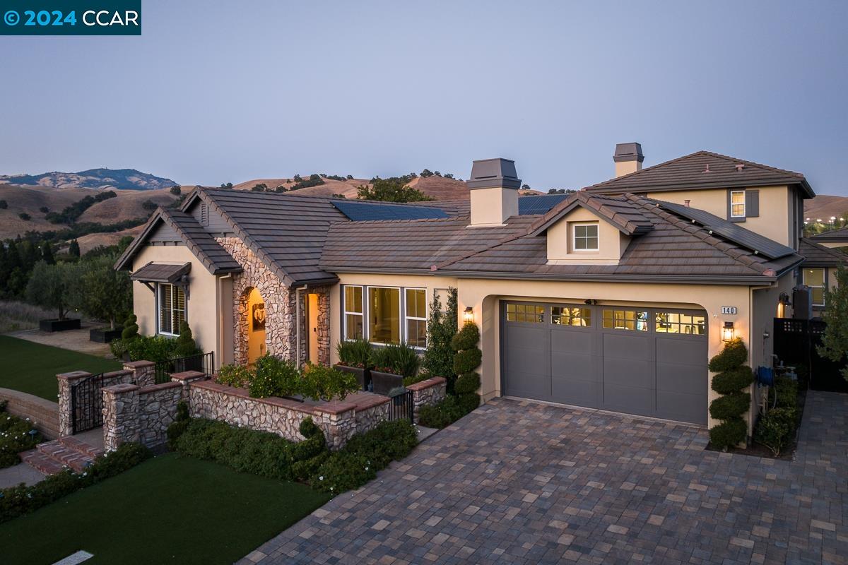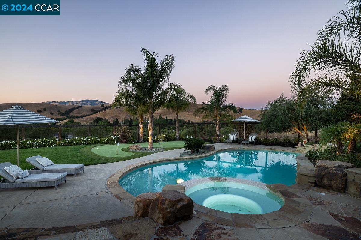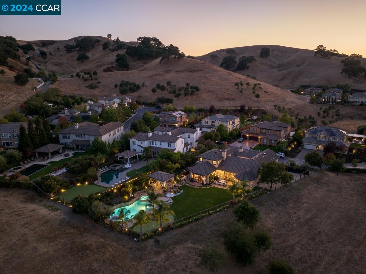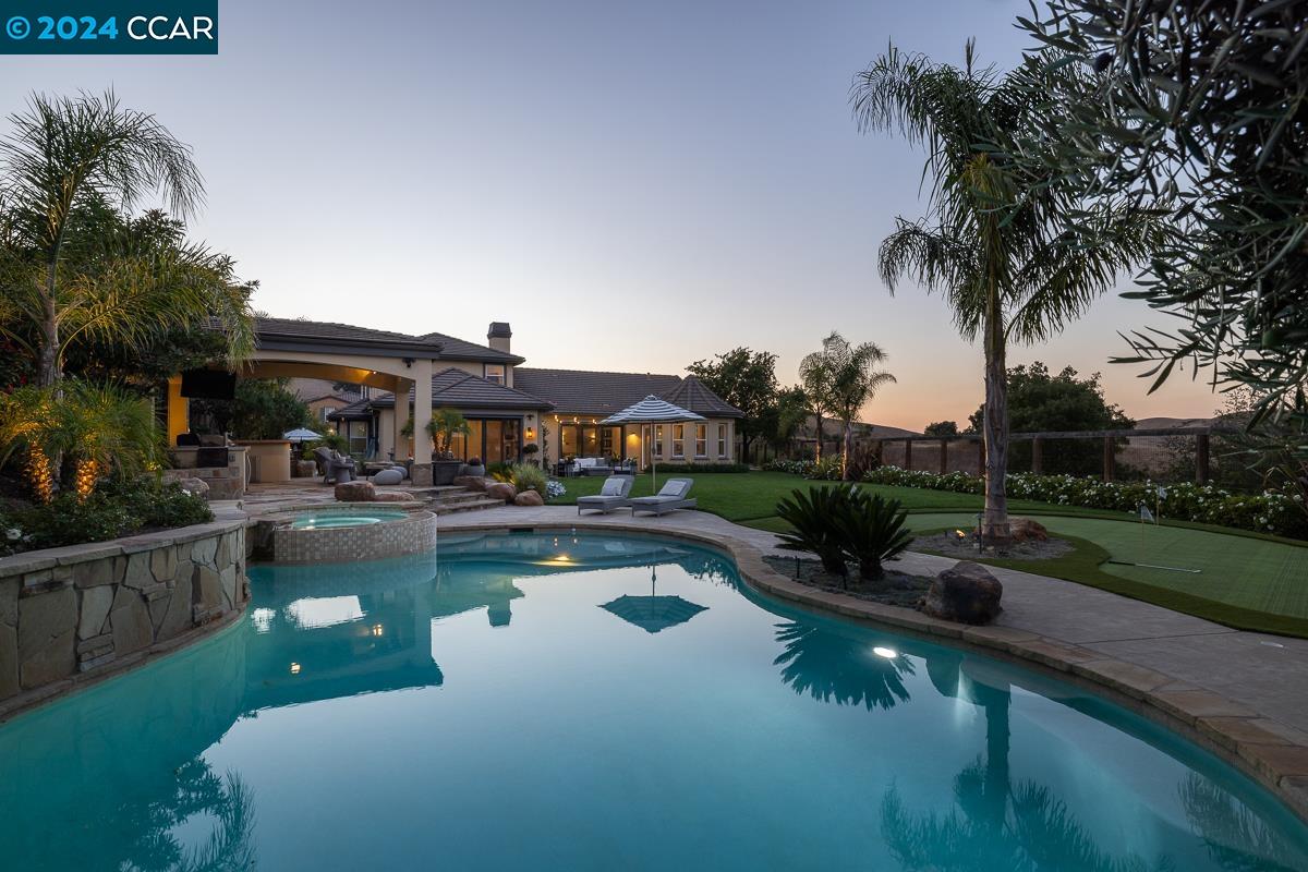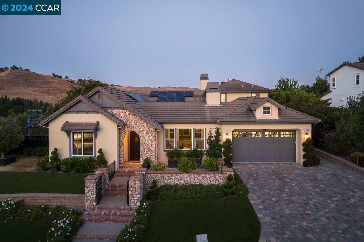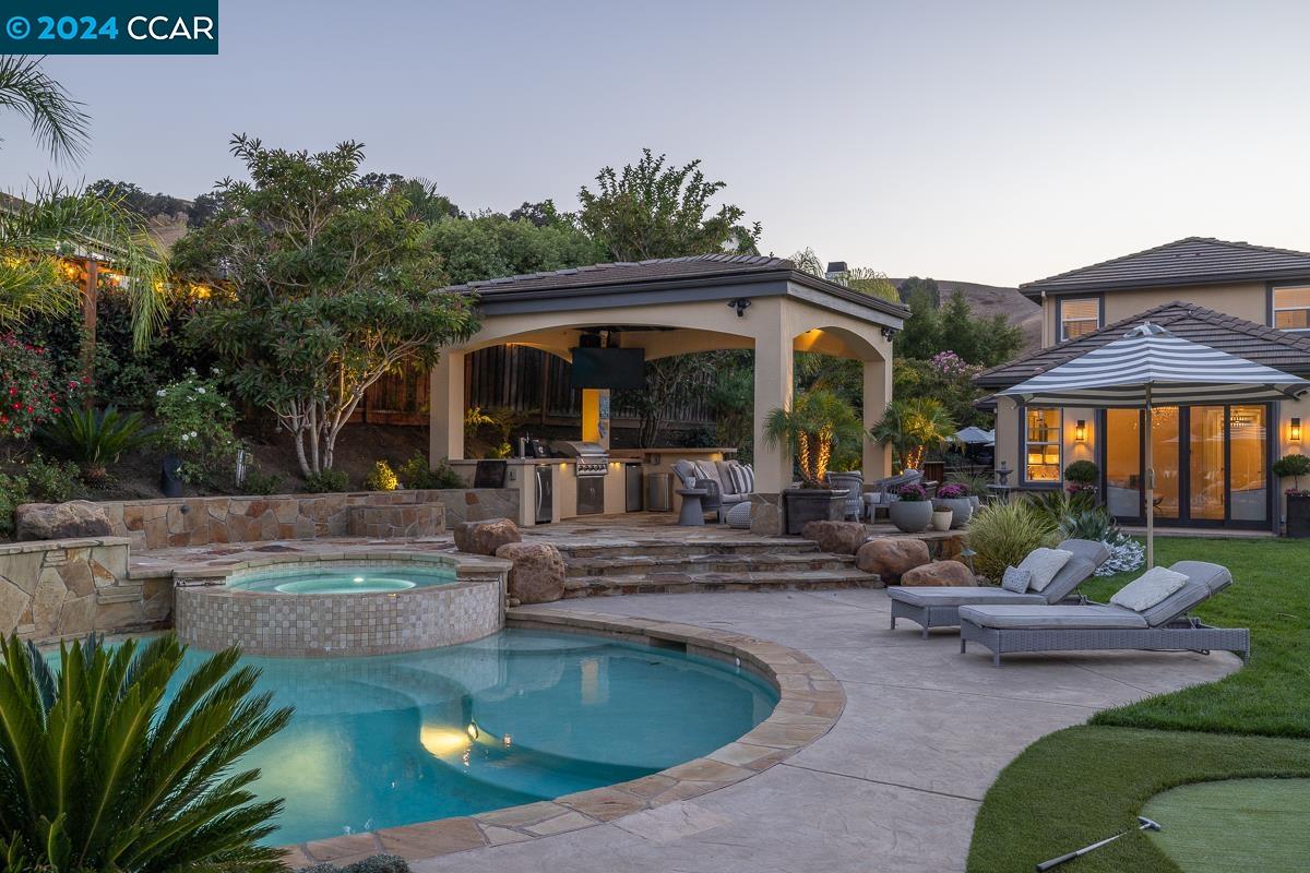 Exquisite VIEW home w/panoramic Mt. Diablo vistas, where luxury meets comfort, a rare find in a coveted location. Beautifully remodeled w/ high-end designer finishes throughout its primarily single-story floorplan, ensuring ease of living, with only a jr. suite upstairs for added privacy. Step inside to discover an open-concept layout, featuring a great room with walls of glass, cozy fireplace and abundance of natural light. Chef's dream kitchen is adorned with natural stone counters, waterfall island, premium appliances & sophisticated cabinetry. Dramatic formal dining room has a custom temp. control wine wall & butler's prep area, offering the perfect setting for intimate dinners or grand entertaining.The primary suite is a sanctuary, offering amazing sunrises, walls of glass leading to the relaxing backyard, lavish bathroom w/steam shower & ample closet space. Additional bedrooms are generously sized, providing comfort & privacy. The spacious office has tranquil courtyard views for work at home days. .44 Acre lot offers a tranquil oasis w/ stunning views of Mt. Diablo & open space. Enjoy the resort-style yard w/pool, spa, pavilion, outdoor kitchen, fire pit, putting green & sport court. This property offers an unparalleled living experience with its impeccable design.