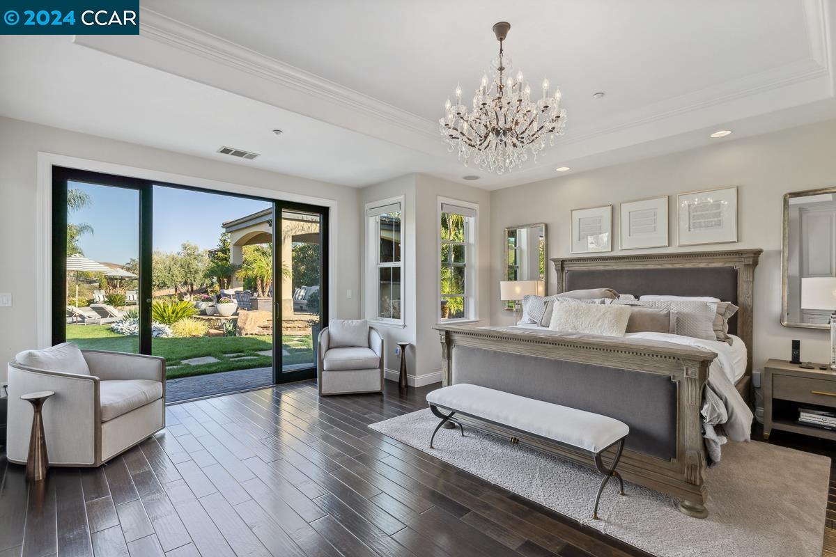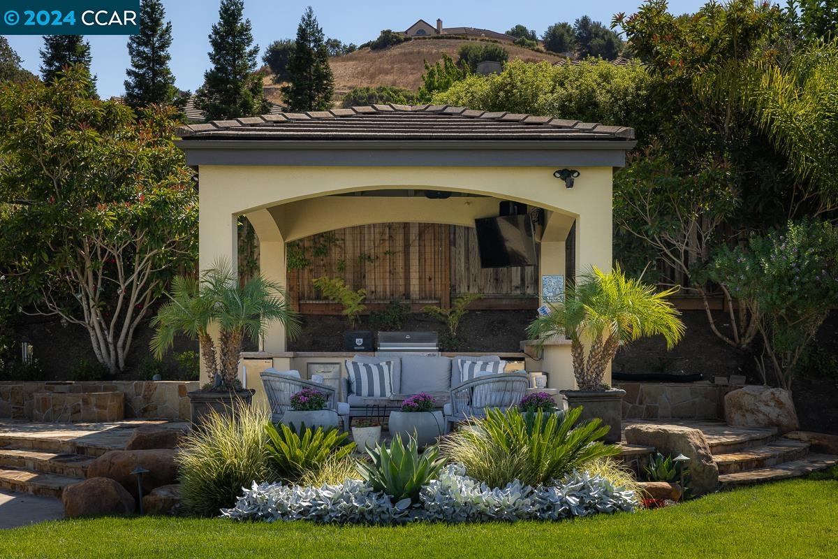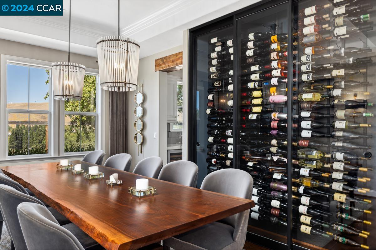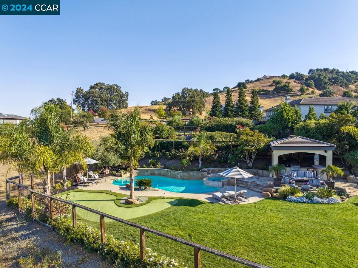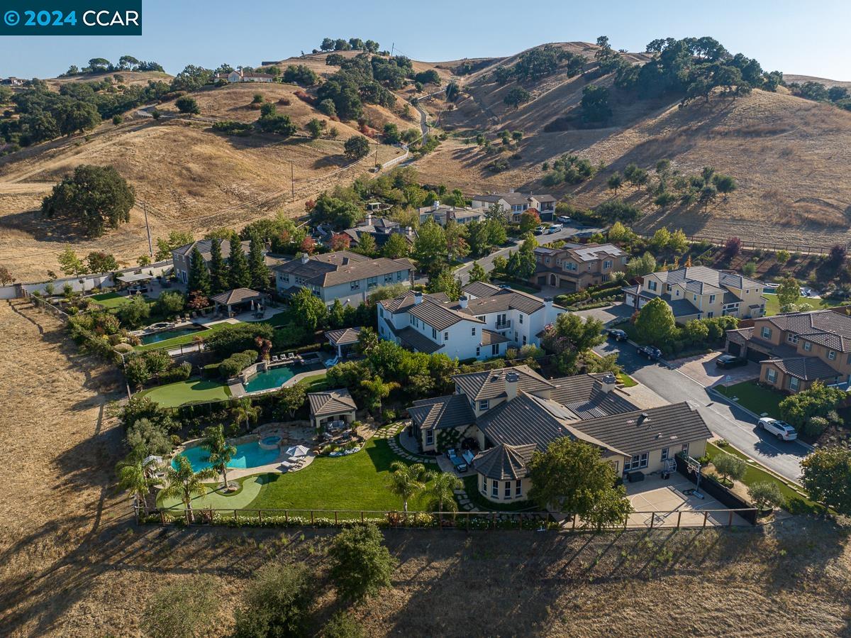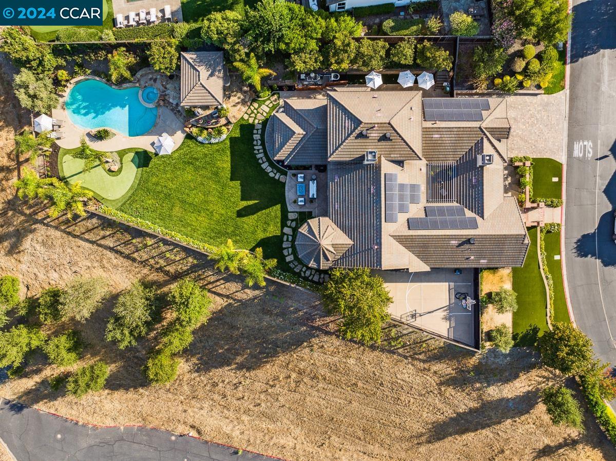 Exquisite VIEW home w/panoramic Mt. Diablo vistas, where luxury meets comfort, a rare find in a coveted location. Beautifully remodeled w/ high-end designer finishes throughout its primarily single-story floorplan, ensuring ease of living, with only a jr. suite upstairs for added privacy. Step inside to discover an open-concept layout, featuring a great room with walls of glass, cozy fireplace and abundance of natural light. Chef's dream kitchen is adorned with natural stone counters, waterfall island, premium appliances & sophisticated cabinetry. Dramatic formal dining room has a custom temp. control wine wall & butler's prep area, offering the perfect setting for intimate dinners or grand entertaining.The primary suite is a sanctuary, offering amazing sunrises, walls of glass leading to the relaxing backyard, lavish bathroom w/steam shower & ample closet space. Additional bedrooms are generously sized, providing comfort & privacy. The spacious office has tranquil courtyard views for work at home days. .44 Acre lot offers a tranquil oasis w/ stunning views of Mt. Diablo & open space. Enjoy the resort-style yard w/pool, spa, pavilion, outdoor kitchen, fire pit, putting green & sport court. This property offers an unparalleled living experience with its impeccable design.