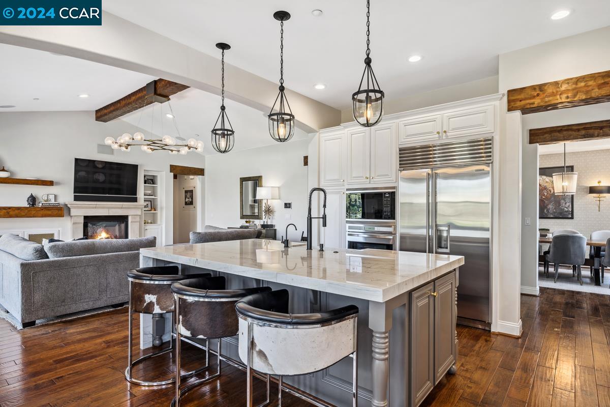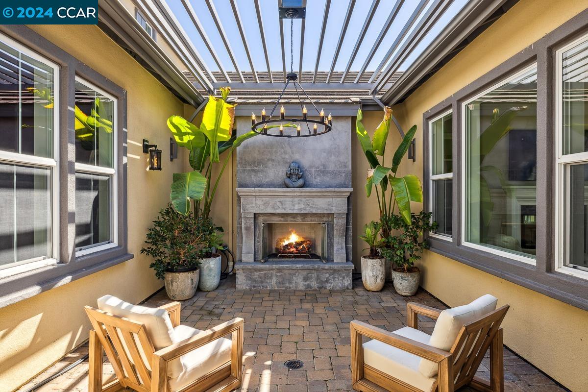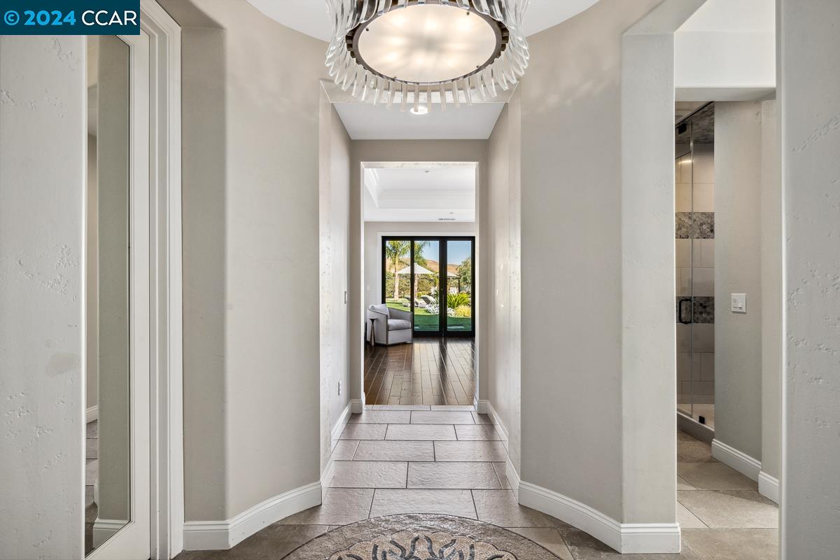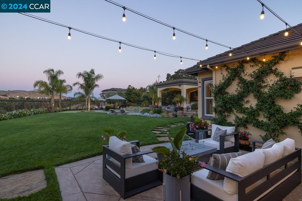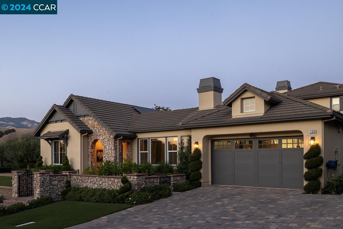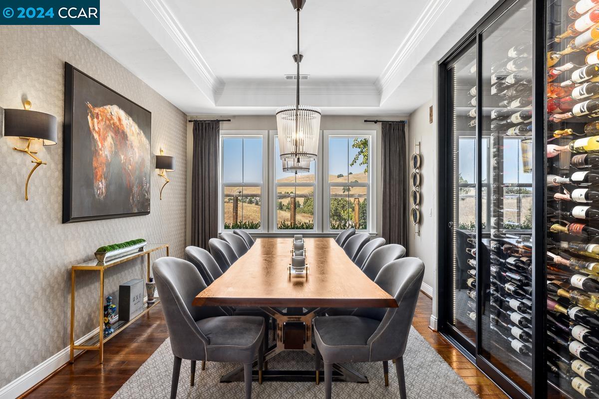 Exquisite VIEW home w/panoramic Mt. Diablo vistas, where luxury meets comfort, a rare find in a coveted location. Beautifully remodeled w/ high-end designer finishes throughout its primarily single-story floorplan, ensuring ease of living, with only a jr. suite upstairs for added privacy. Step inside to discover an open-concept layout, featuring a great room with walls of glass, cozy fireplace and abundance of natural light. Chef's dream kitchen is adorned with natural stone counters, waterfall island, premium appliances & sophisticated cabinetry. Dramatic formal dining room has a custom temp. control wine wall & butler's prep area, offering the perfect setting for intimate dinners or grand entertaining.The primary suite is a sanctuary, offering amazing sunrises, walls of glass leading to the relaxing backyard, lavish bathroom w/steam shower & ample closet space. Additional bedrooms are generously sized, providing comfort & privacy. The spacious office has tranquil courtyard views for work at home days. .44 Acre lot offers a tranquil oasis w/ stunning views of Mt. Diablo & open space. Enjoy the resort-style yard w/pool, spa, pavilion, outdoor kitchen, fire pit, putting green & sport court. This property offers an unparalleled living experience with its impeccable design.