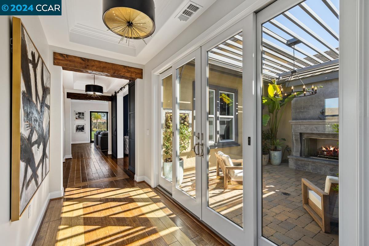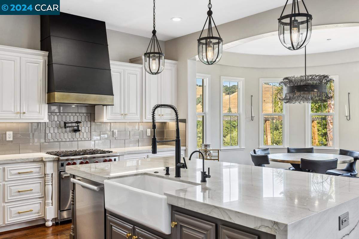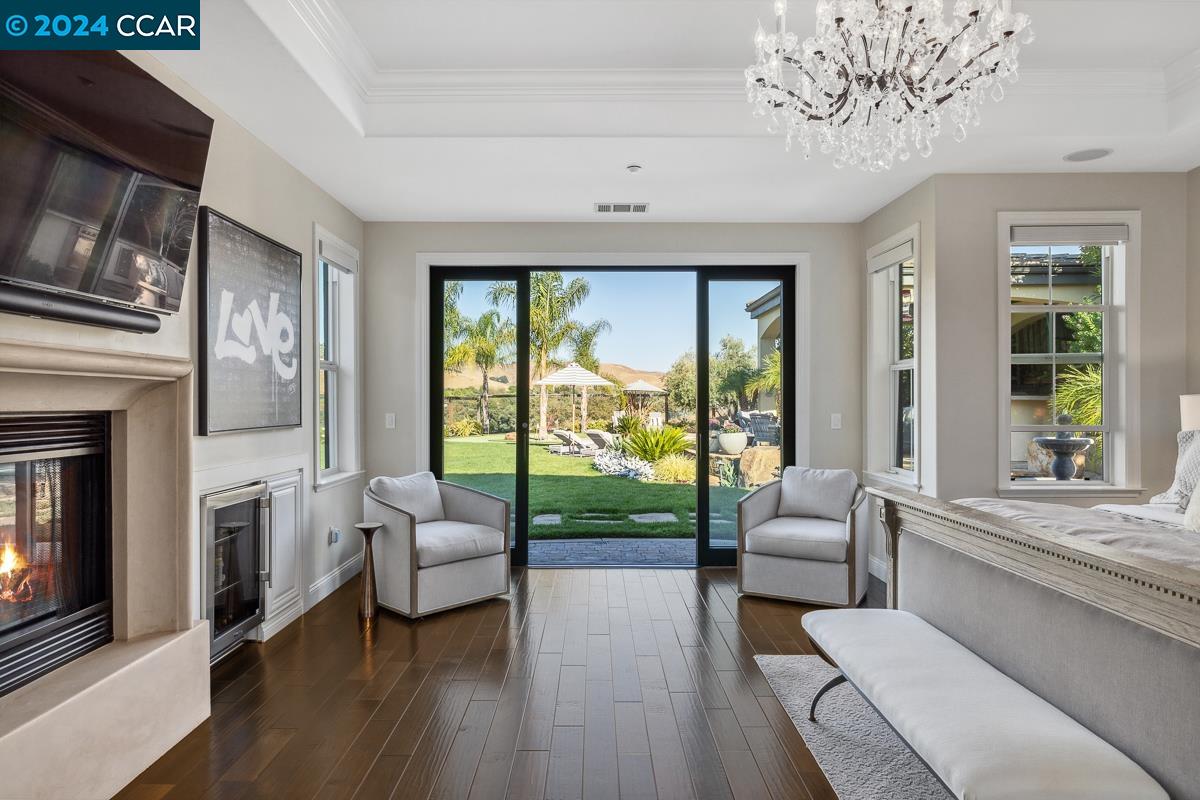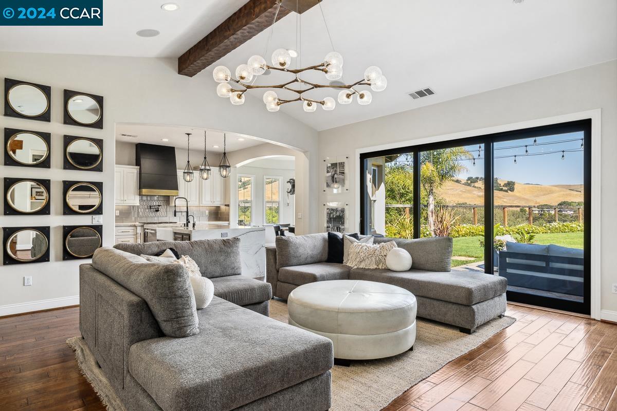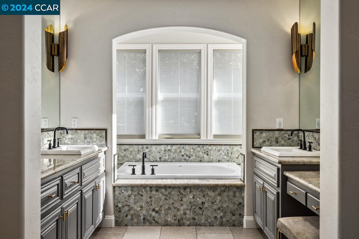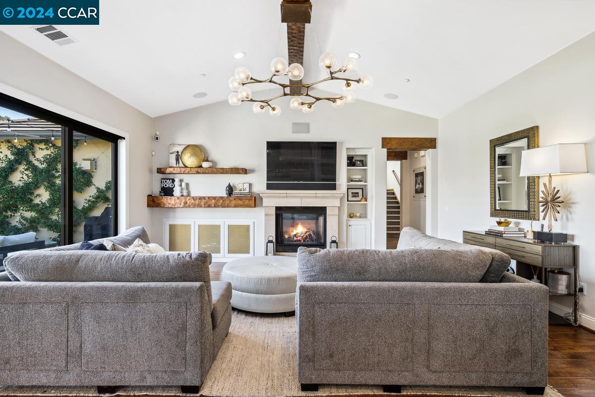 Exquisite VIEW home w/panoramic Mt. Diablo vistas, where luxury meets comfort, a rare find in a coveted location. Beautifully remodeled w/ high-end designer finishes throughout its primarily single-story floorplan, ensuring ease of living, with only a jr. suite upstairs for added privacy. Step inside to discover an open-concept layout, featuring a great room with walls of glass, cozy fireplace and abundance of natural light. Chef's dream kitchen is adorned with natural stone counters, waterfall island, premium appliances & sophisticated cabinetry. Dramatic formal dining room has a custom temp. control wine wall & butler's prep area, offering the perfect setting for intimate dinners or grand entertaining.The primary suite is a sanctuary, offering amazing sunrises, walls of glass leading to the relaxing backyard, lavish bathroom w/steam shower & ample closet space. Additional bedrooms are generously sized, providing comfort & privacy. The spacious office has tranquil courtyard views for work at home days. .44 Acre lot offers a tranquil oasis w/ stunning views of Mt. Diablo & open space. Enjoy the resort-style yard w/pool, spa, pavilion, outdoor kitchen, fire pit, putting green & sport court. This property offers an unparalleled living experience with its impeccable design.