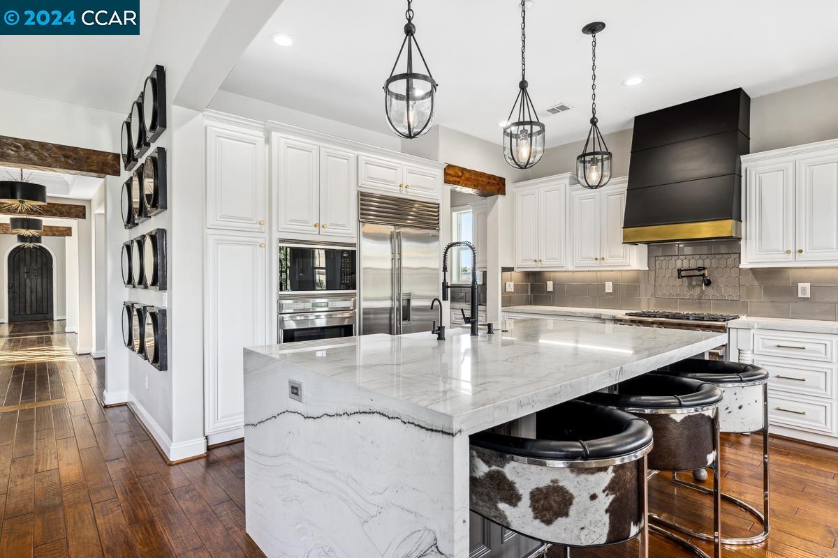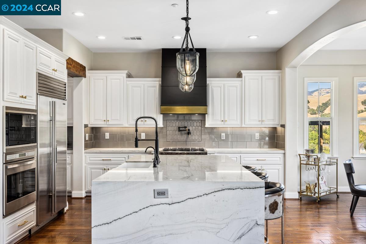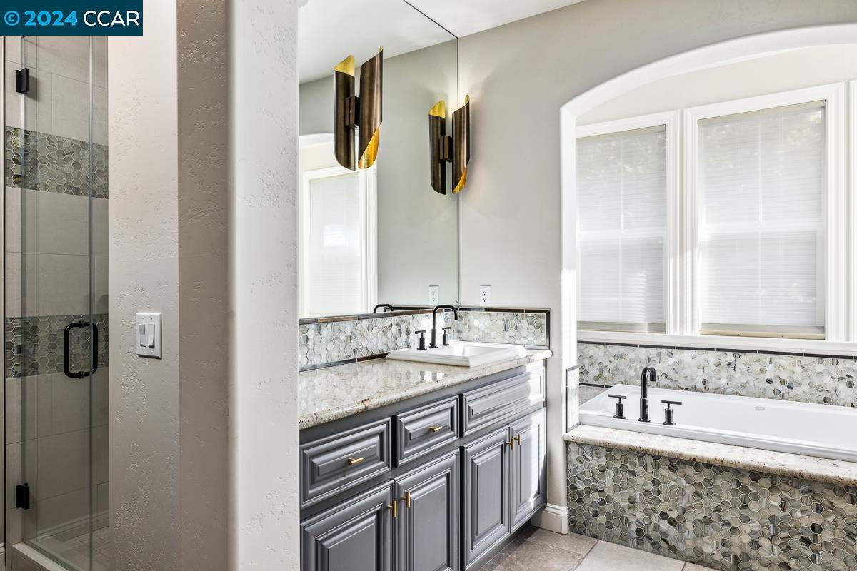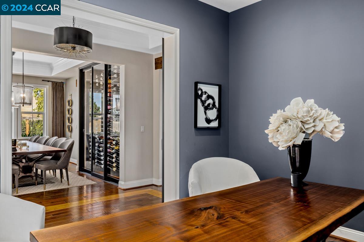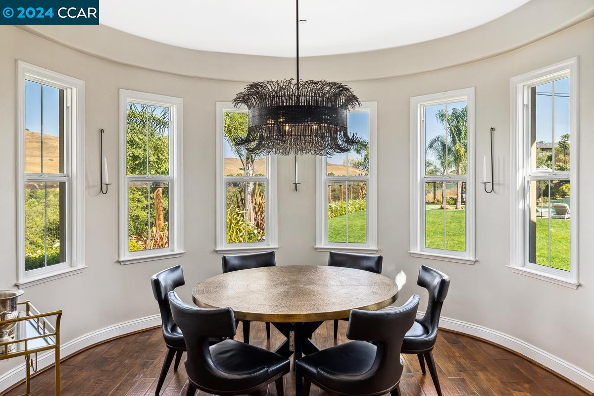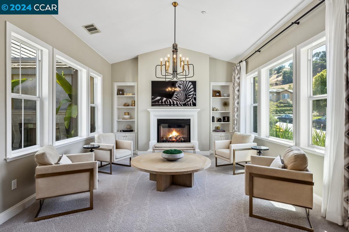 Exquisite VIEW home w/panoramic Mt. Diablo vistas, where luxury meets comfort, a rare find in a coveted location. Beautifully remodeled w/ high-end designer finishes throughout its primarily single-story floorplan, ensuring ease of living, with only a jr. suite upstairs for added privacy. Step inside to discover an open-concept layout, featuring a great room with walls of glass, cozy fireplace and abundance of natural light. Chef's dream kitchen is adorned with natural stone counters, waterfall island, premium appliances & sophisticated cabinetry. Dramatic formal dining room has a custom temp. control wine wall & butler's prep area, offering the perfect setting for intimate dinners or grand entertaining.The primary suite is a sanctuary, offering amazing sunrises, walls of glass leading to the relaxing backyard, lavish bathroom w/steam shower & ample closet space. Additional bedrooms are generously sized, providing comfort & privacy. The spacious office has tranquil courtyard views for work at home days. .44 Acre lot offers a tranquil oasis w/ stunning views of Mt. Diablo & open space. Enjoy the resort-style yard w/pool, spa, pavilion, outdoor kitchen, fire pit, putting green & sport court. This property offers an unparalleled living experience with its impeccable design.